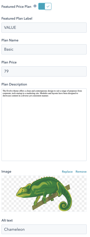 Choose the image you want to display in your price card. Add your alt text into the corresponding field.