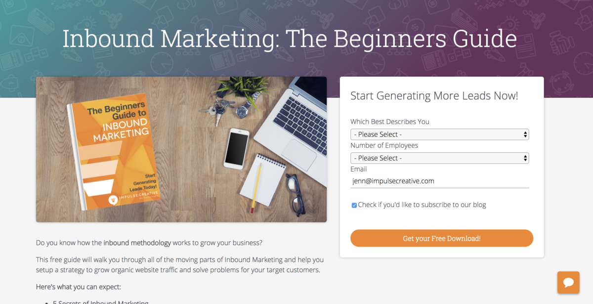 Here’s a sample of a landing page on for an Inbound Marketing Beginner’s Guide, as depicted below: