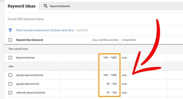 9. Look for your opportunity keywords. Find a phrase that’s above 500 monthly searches a month to justify investing your time in pursuing it. For this article, one term we’re trying to rank for is “how to use Google keyword planner,” which has roughly 560 searches. The competition and bids are low, and our chances of getting organic traffic from it are high! This isn’t an exact science, but you will need to dig through your keyword data and use your best judgment.
