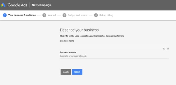 See steps three and four in their “New Campaign” setup below. The keyword suggestion tool is essentially gated behind this initial form.