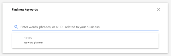 3. Choose three solid search phrases. You will then see a search bar to “Enter words, phrases, or a URL related to your business,” and, if you’ve used the tool recently, past searches for convenient reference. Here’s your chance to pick a few solid, short phrases that you are thinking about targeting. If you need help narrowing down these first few phrases, read our other article about finding the right Google keywords for your business. Generally when first starting out, these phrases can be high-level or broad and topically-related in nature to give you a variety of options.